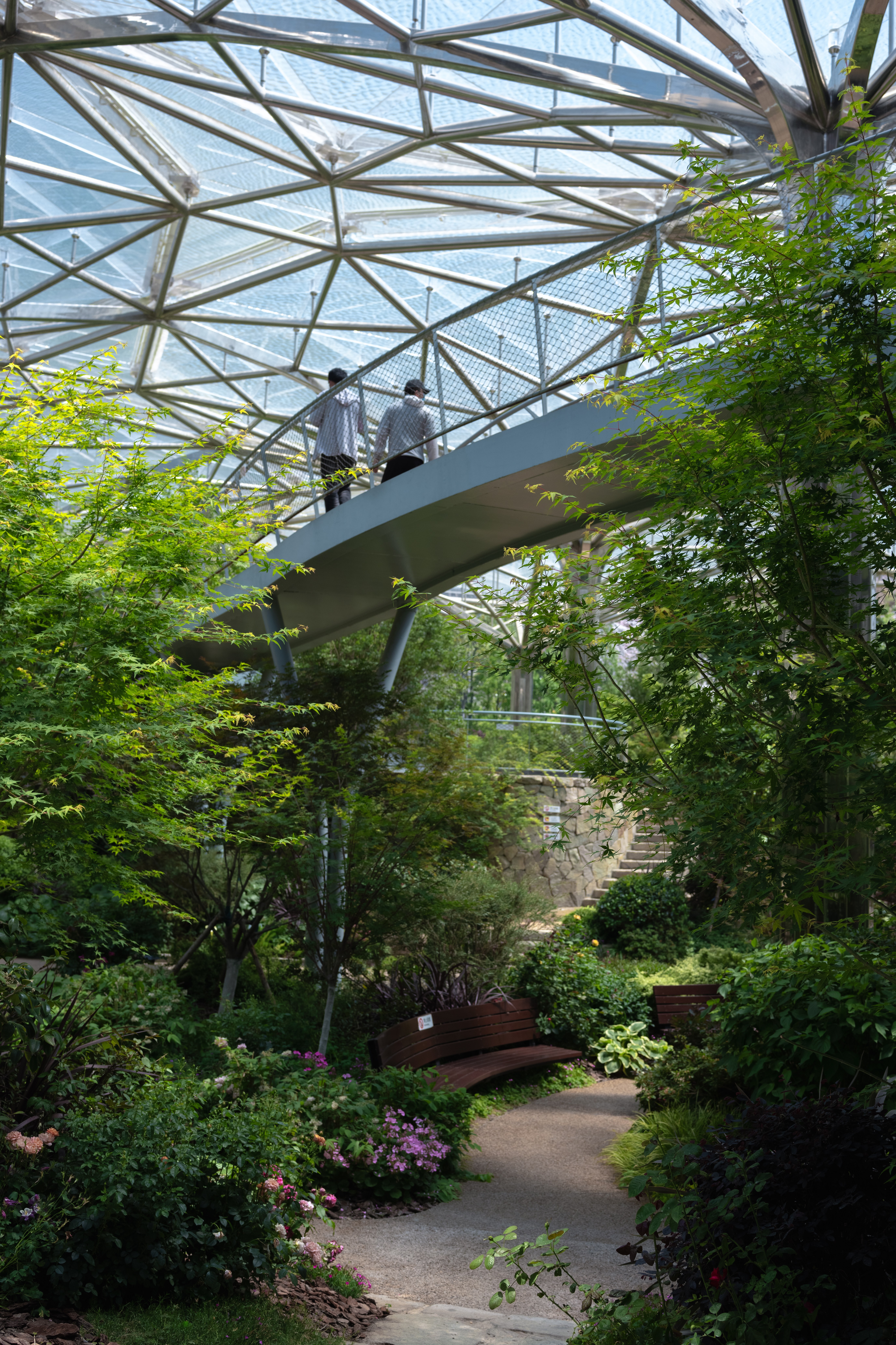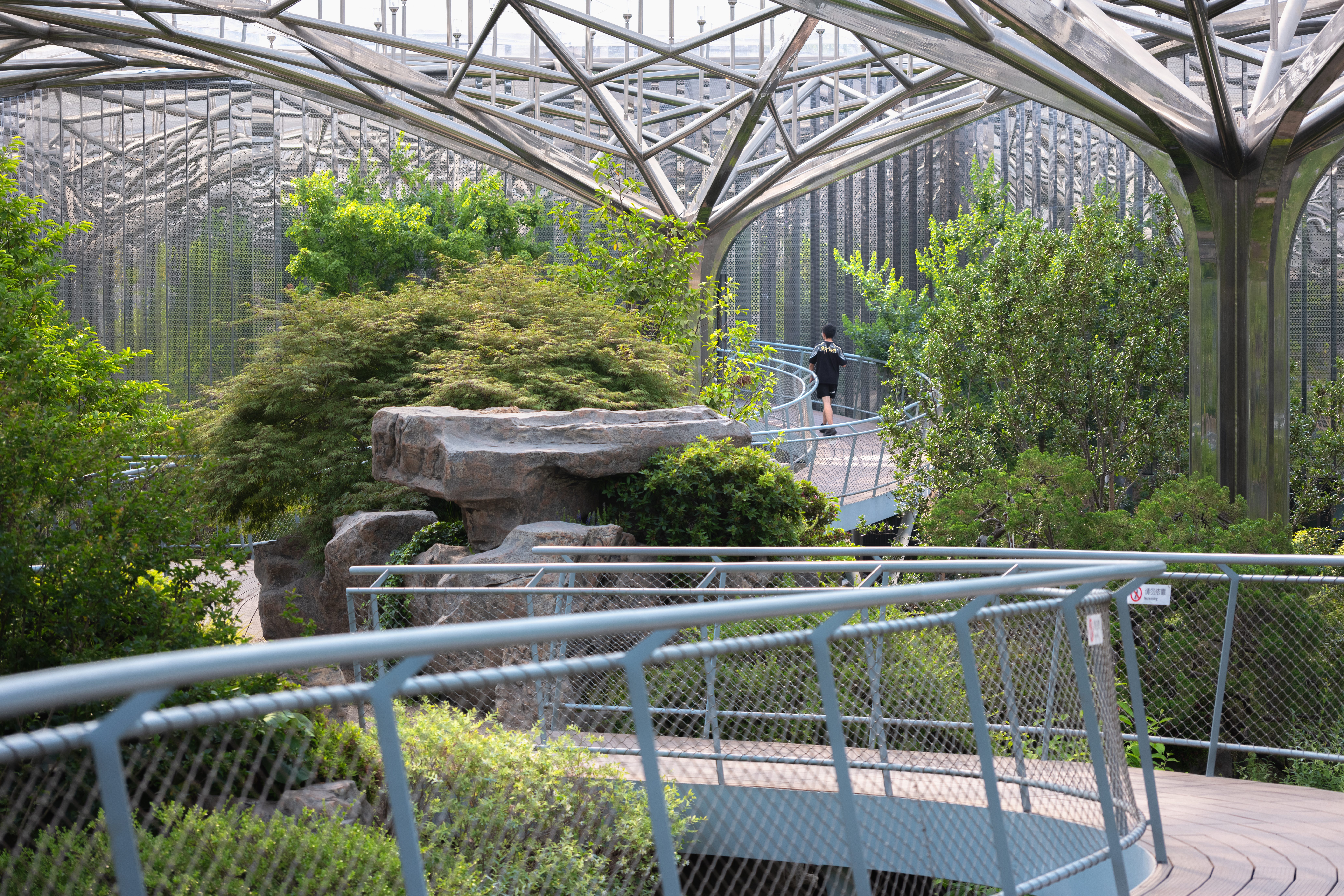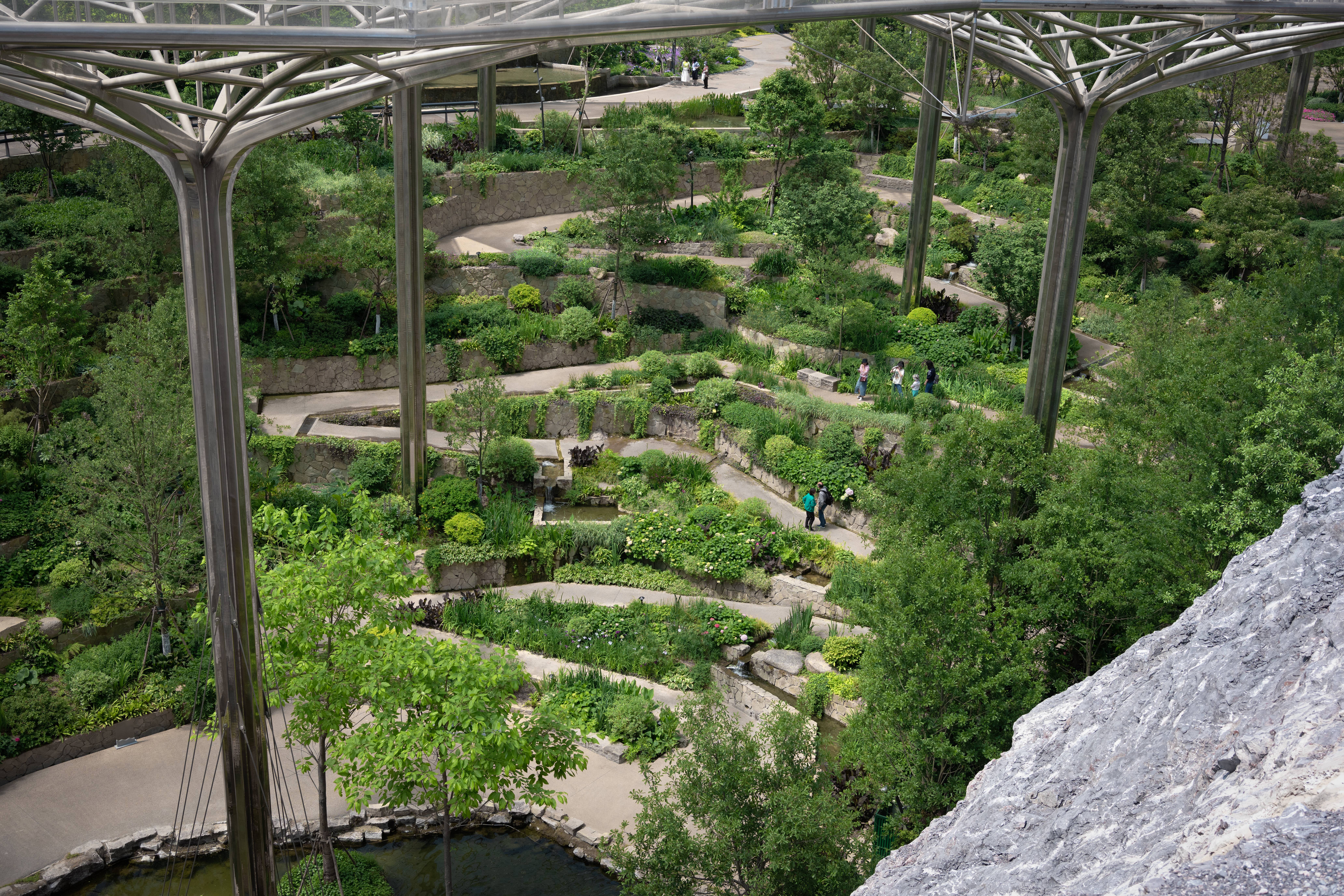 未来花园是2021年江苏省园艺博览会的核心展区,位于南京江宁汤山北部一处废弃采石矿坑内,项目以“生态修复与创新设计”为理念,致力于将工业遗址转化为集自然景观、建筑艺术与科技体验于一体的生态文旅综合体。园区所在矿坑长1100米、宽180米、深10至22米,设计保留地质肌理,植入现代建筑与景观元素,如“水下植物园”由镜面不锈钢伞壳结构与水幕系统构成,内部划分旱生、中生、湿生三大生态区,种植800余种植物,设置12个主题展区。